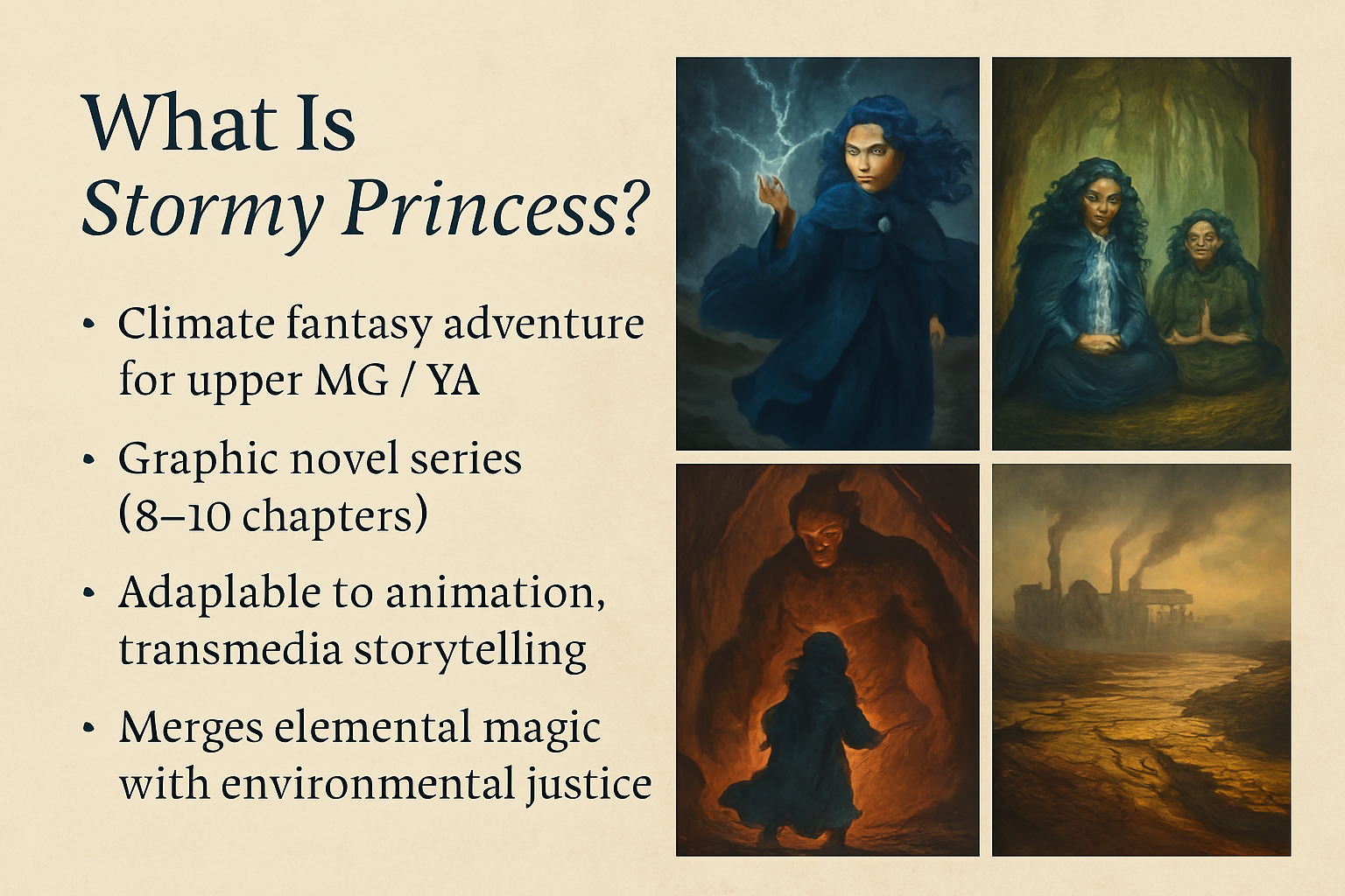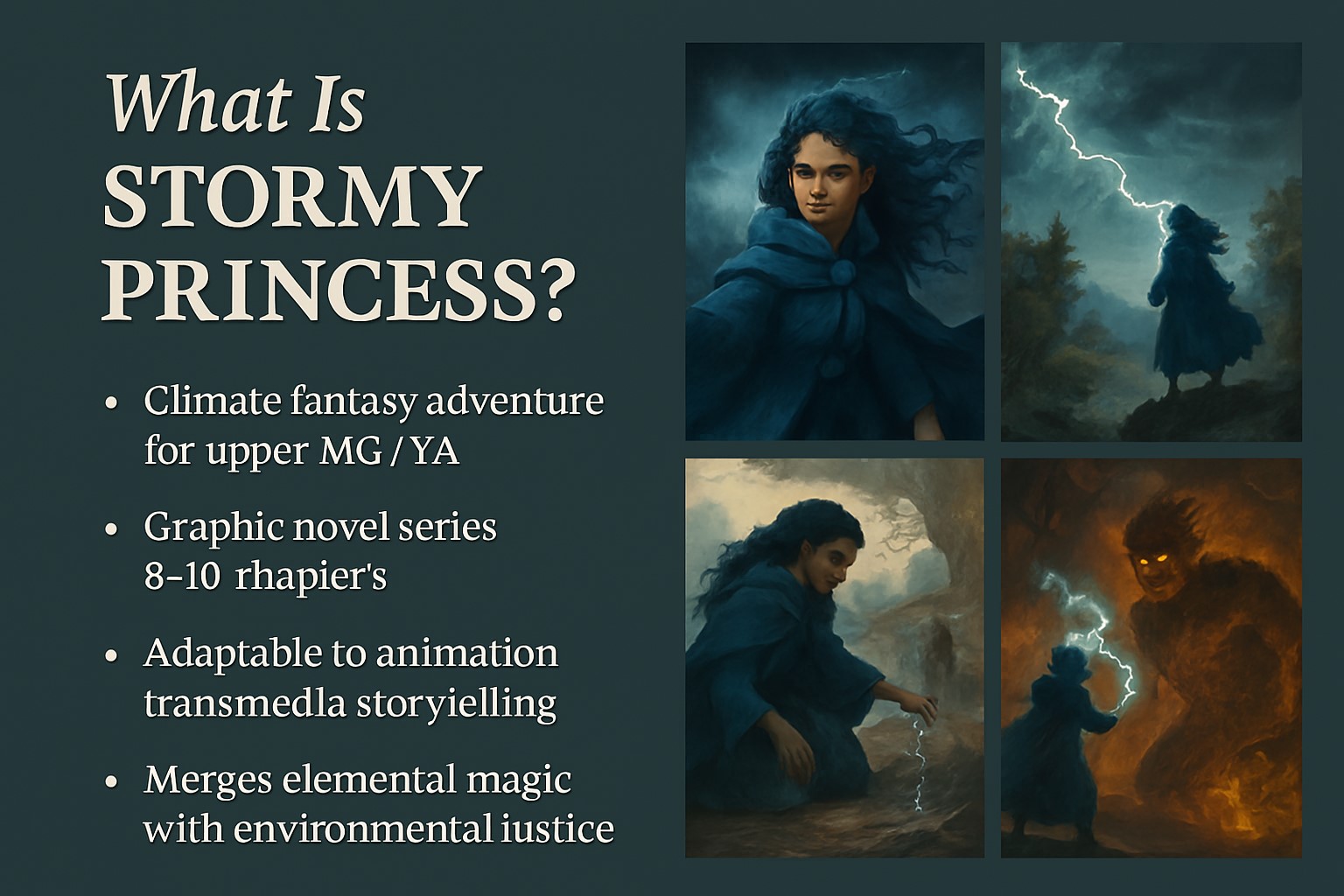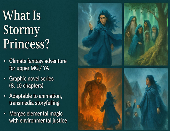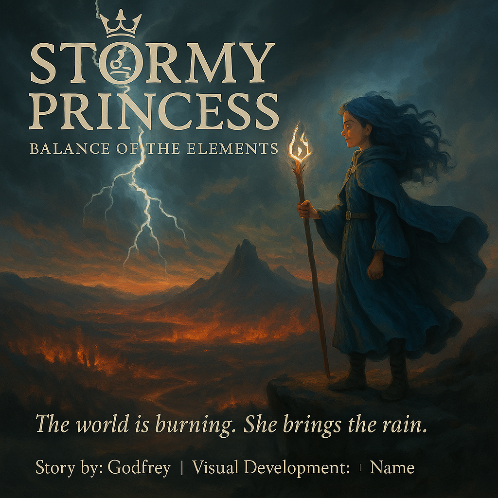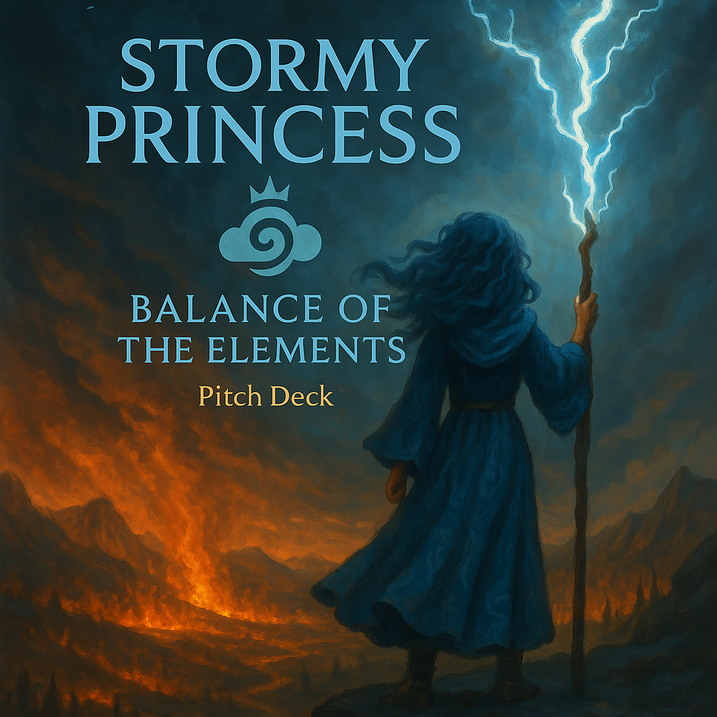 Stormy Princess: Balance of the Elements is a climate fantasy graphic novel and animated pitch about a girl born of storm and sea who restores a world ravaged by elemental collapse. She brings balance, not destruction - healing people, ecosystems, and even her enemies.