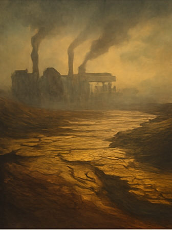 Closer view of riverbed now dry, a forgotten toy boat stuck in the slit. In the distance, factory towers billow dark smoke.