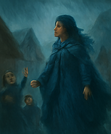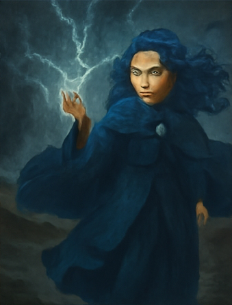 Medium shot of Stormy Princess standing on the peak, arms outstretched as her cloak flutters like a thundercloud. Her eyes glow faintly with power.